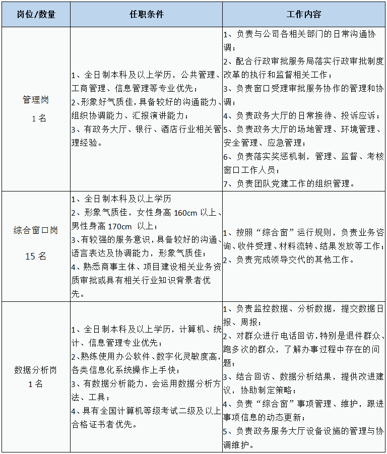為全面落實《國務(wù)院關(guān)于加快推進政務(wù)服務(wù)標準化規(guī)范化便利化的指導(dǎo)意見》(國發(fā)「2022」5 號)要求,進一步深化政務(wù)服務(wù)“綜合窗”改革,快速提升政務(wù)服務(wù)工作品質(zhì),助力長沙縣高質(zhì)量發(fā)展,長沙縣政務(wù)服務(wù)中心全面推行綜合窗口工作模式。西安咸有孚人力資源服務(wù)有限公司為長沙縣政務(wù)服務(wù)中心提供綜合窗口服務(wù),招聘綜合窗口工作人員。現(xiàn)將有關(guān)情況說明如下:一、 崗位及要求本次招聘崗位內(nèi)容如下表: