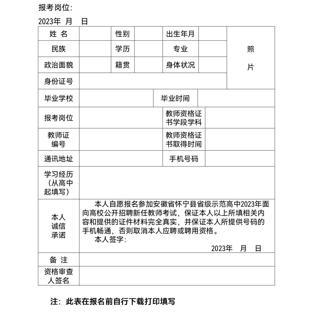 1.《安徽省懷寧縣省級示范高中2023年度面向高校公開招聘新任教師報名表》